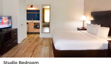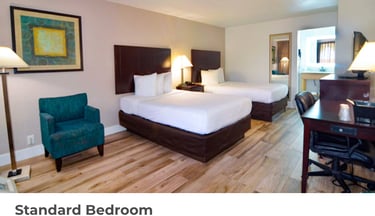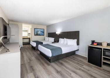 São quatro unidades: três na International Drive, próximas à Universal e à área mais turística, e uma em Lake Buena Vista, próxima aos parques da Disney.Todos oferecem limpeza diária, quartos com duas camas Queen (com possibilidade de cama extra para até 5 pessoas), frigobar, micro-ondas, Wi-Fi e estacionamento gratuito. O hotel conta ainda com buffet de café da manhã pago à parte e não cobra taxa de resort no check-in.A única desvantagem é que os quartos não foram reformados após a pandemia e todos possuem carpete, que mesmo limpos diariamente apresentam manchas antigas.