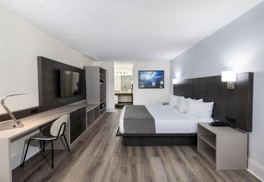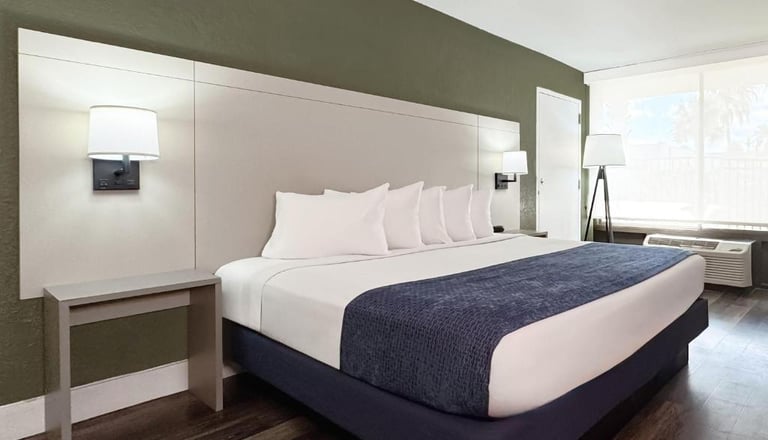O Woodspring é um hotel econômico em Orlando que oferece quartos simples com piso sem carpete e uma cozinha básica, sem utensílios como panelas, pratos ou talheres, sendo uma alternativa interessante para quem está com orçamento limitado mas precisa desse recurso. As suítes acomodam até 4 pessoas em camas queen ou king-size, algumas com sofá-cama, e contam com Wi-Fi, estacionamento gratuito e lavanderia. A limpeza não é diária, sendo realizada a cada 14 dias, podendo ser solicitada antes mediante taxa extra. Uma opção prática para quem busca hospedagem barata, bem localizada e funcional.